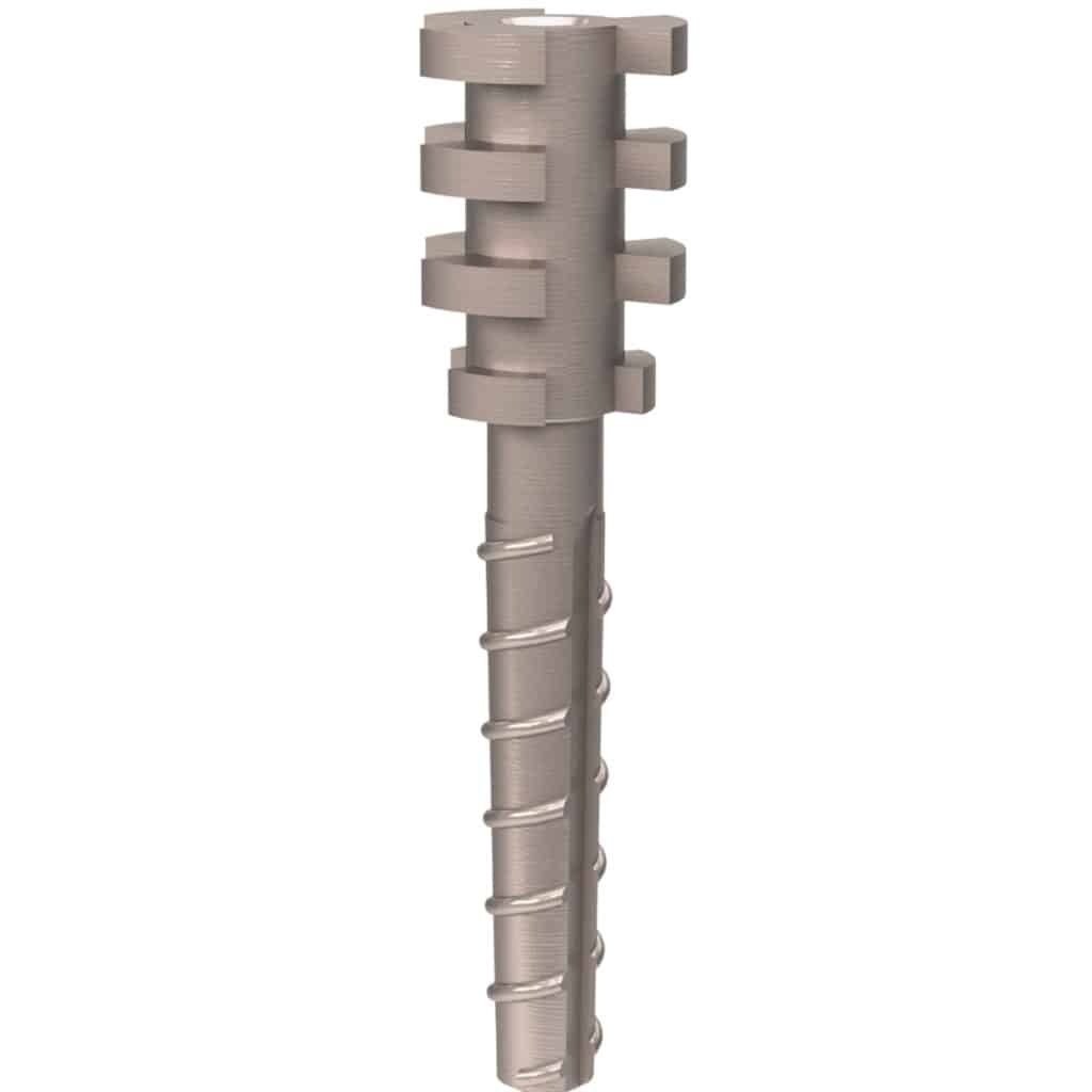 Ancrage radiculaire avec tête rétentive et filetage auto-taraudant.